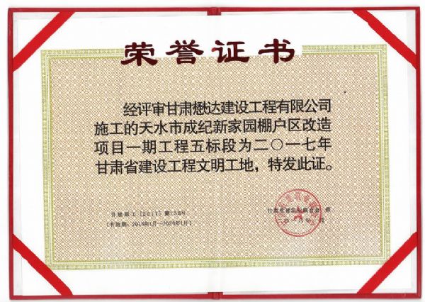 日前,由甘肅懋達建設工程有限公司承建的徽縣宜和家苑住宅小區項目、天水市成紀新家園棚戶區改造項目一期工程五標段項目在2017年全省建筑業“三優一文明”評選中喜獲“2017年甘肅省建設工程文明工地”榮譽稱號。