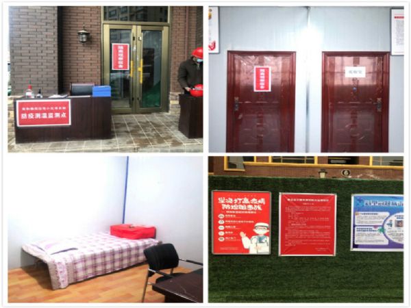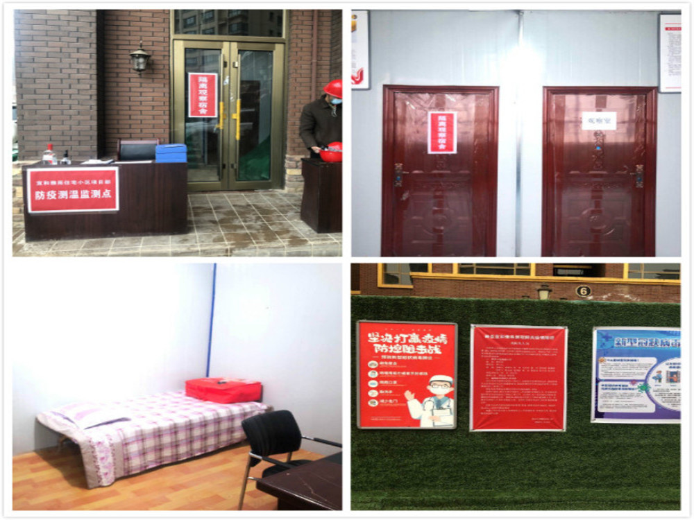 工地現場疫情檢測點、隔離觀察室及宣傳海報。