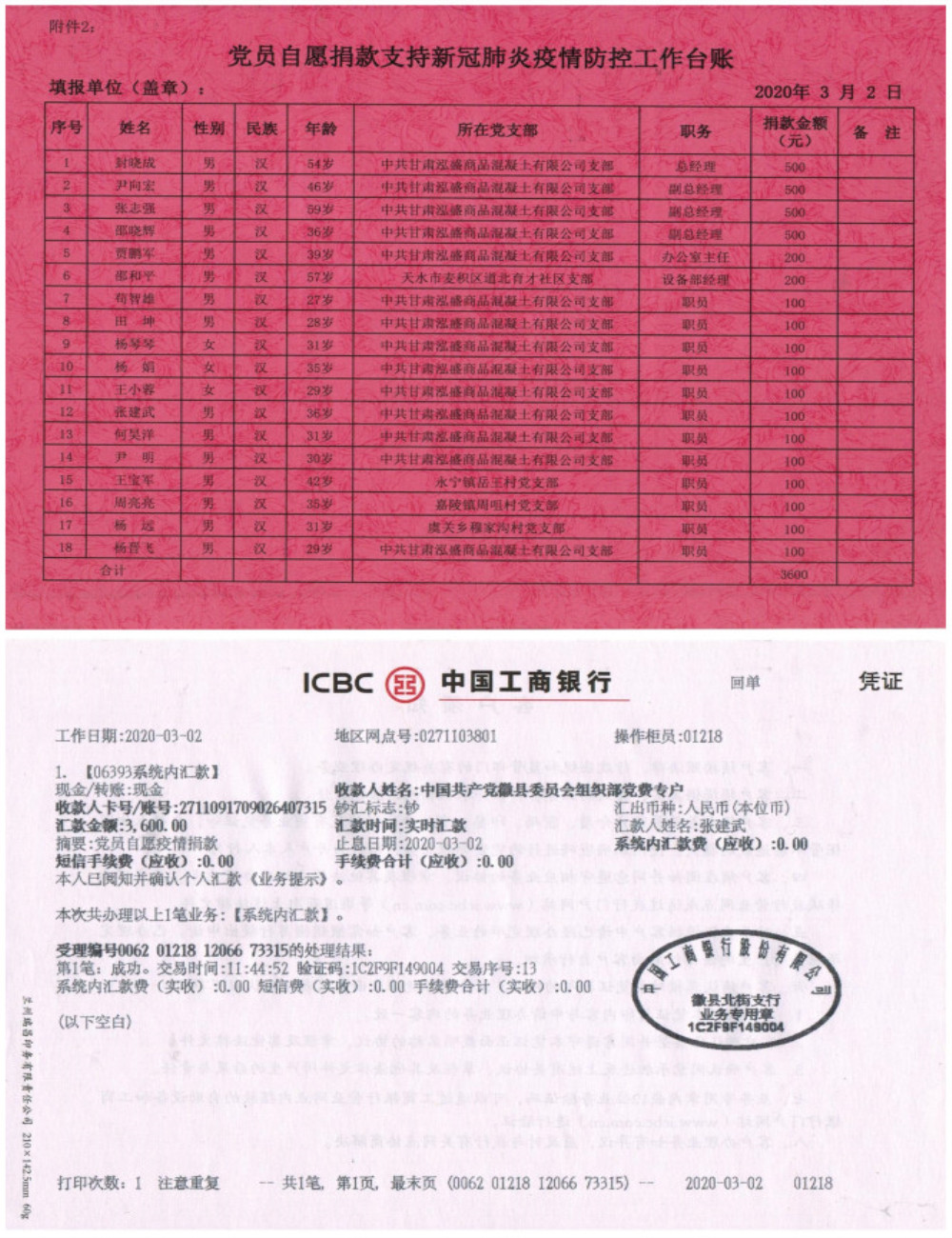 為積極響應黨中央對廣大黨員的號召,表達對新冠肺炎疫情防控工作的支持,3月2日,甘肅泓盛商品混凝土有限公司黨支部組織開展抗擊疫情自愿捐款活動。全體黨員支持疫情防控斗爭愿望強烈,紛紛踴躍捐款。支部18名黨員(含預備黨員)共計捐款3600元,已按組織程序上繳中國共產黨徽縣委員會組織部黨費專戶。