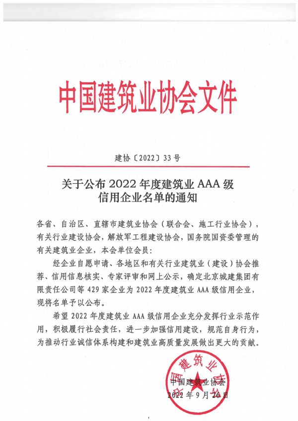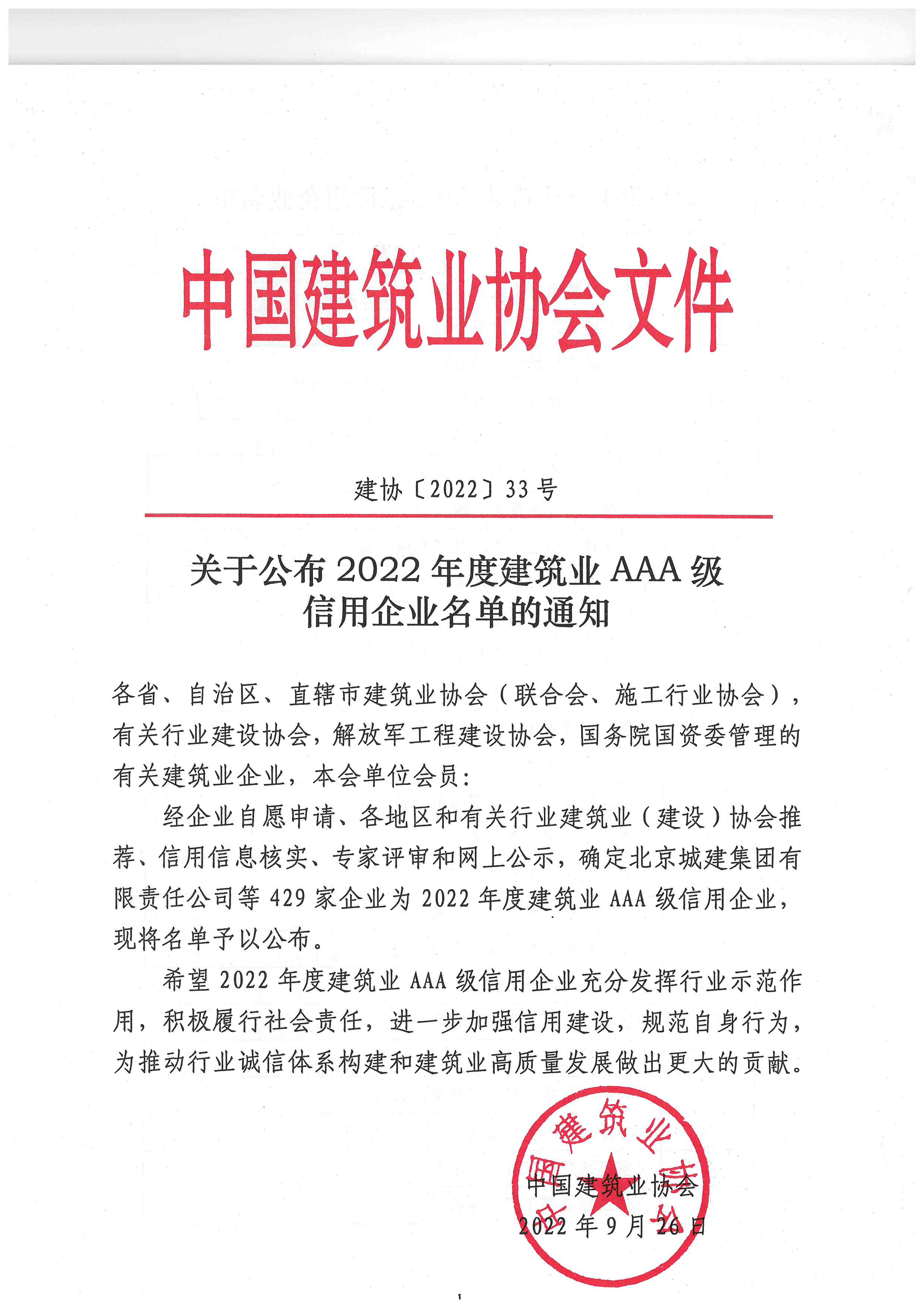 近日從中國建筑業協會傳來捷報公司獲評2022年度“建筑業AAA級信用企業”