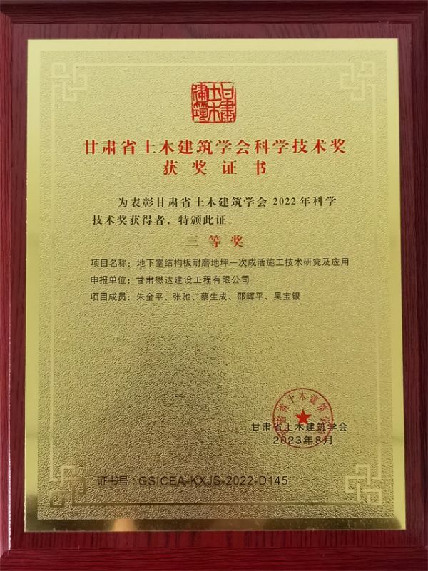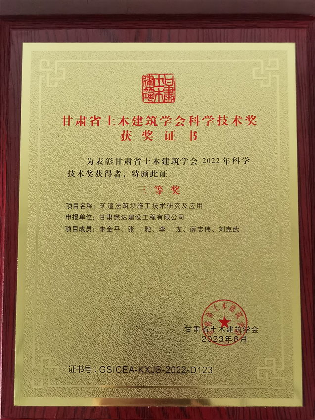 近日,甘肅省建設行業科技創新成果研討會暨頒獎典禮在蘭州隆重舉行。甘肅懋達建設工程有限公司申報的“地下室結構板耐磨地坪一次成活施工技術研究及應用”和“礦渣法筑壩施工技術研究及應用”分別榮獲2022年度甘肅省土木建筑學會科學技術三等獎,8名項目成員獲得大會表彰獎勵。