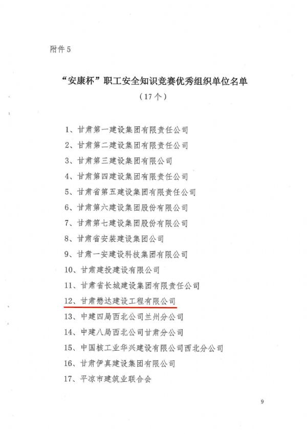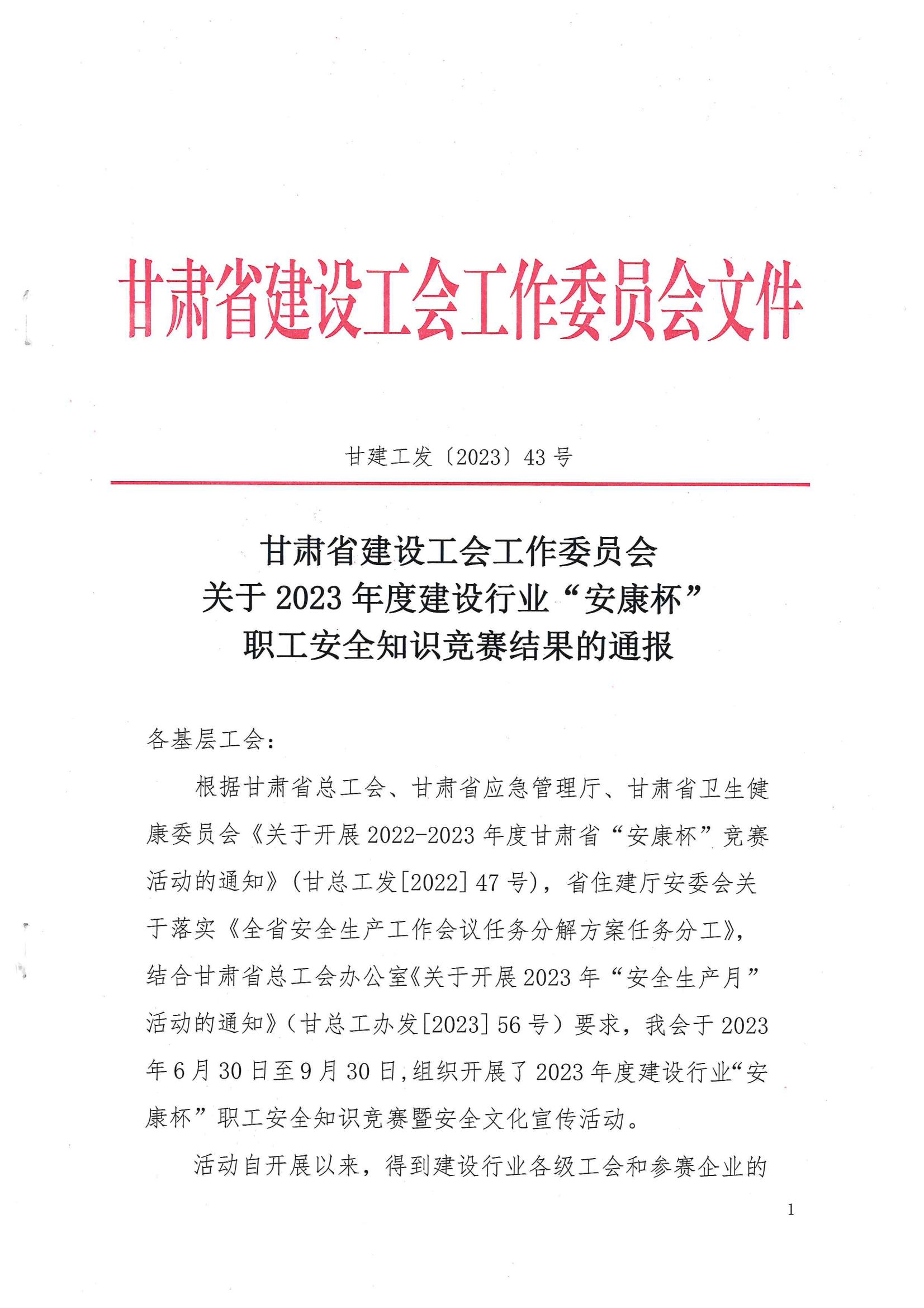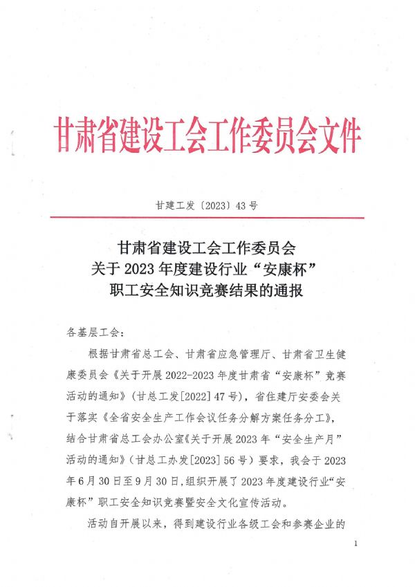 近日,甘肅省建設工會召開表彰大會,對在2023年度建設行業(yè)“安康杯”職工安全知識競賽暨安全文化宣傳活動中成績突出的企業(yè)、班組及個人進行表彰獎勵。