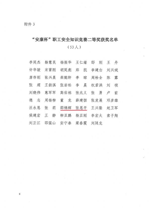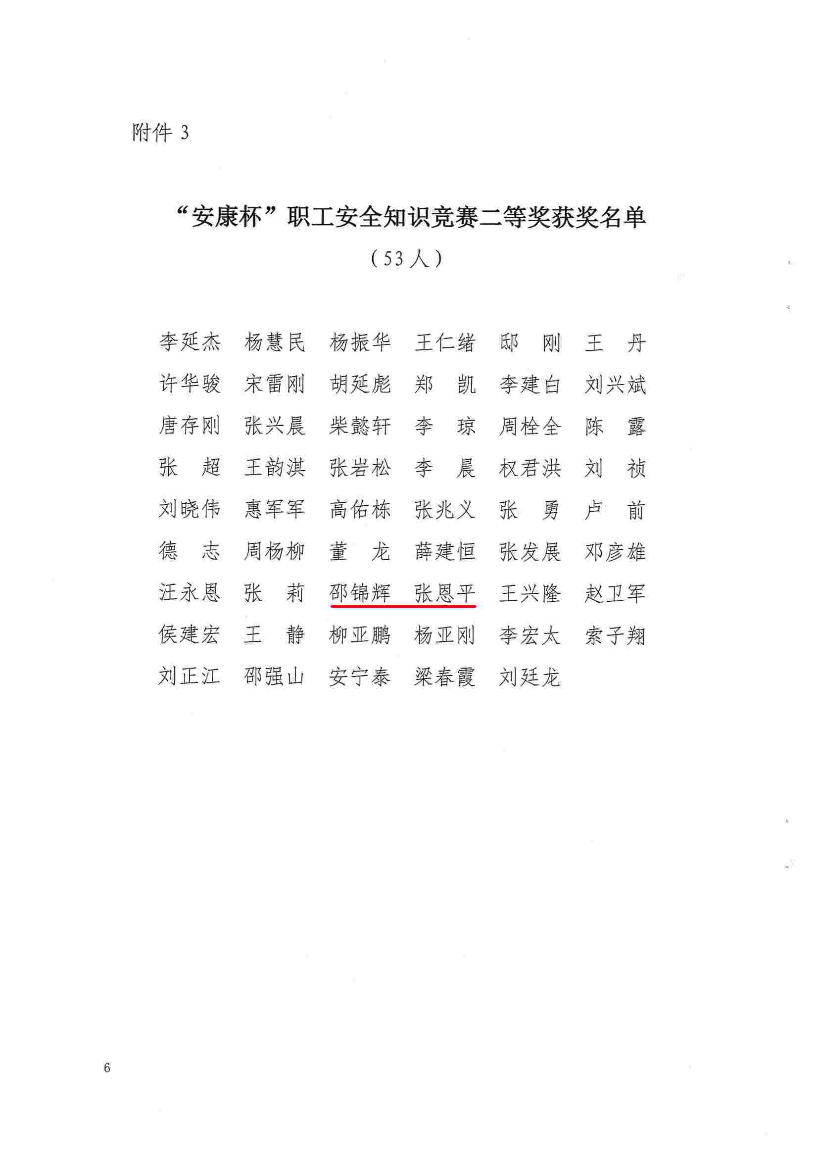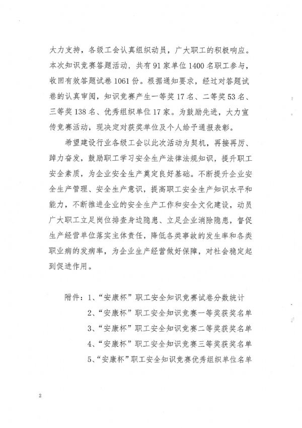 此次活動以“排查整治安全隱患、共促安全健康發(fā)展”為主題,于今年6月30日至9月30日,在全省組織開展了2023年度建設行業(yè)“安康杯”職工安全知識競賽暨安全文化宣傳活動。公司共有兩名員工榮獲“安康杯”職工安全知識競賽二等獎,八名員工榮獲三等獎,公司榮獲“安康杯”職工安全知識競賽“優(yōu)秀組織獎”。