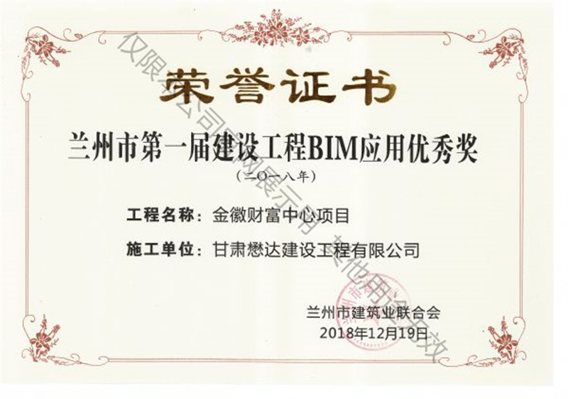 金徽財富中心項目--蘭州市第一屆建設工程BIM應用優秀獎