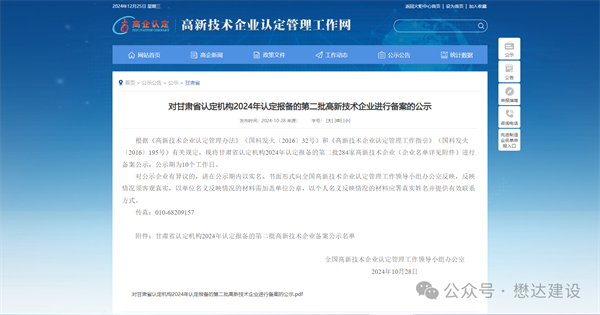 近日,根據《高新技術企業認定管理辦法》(國科發火〔2016〕32號)和《高新技術企業認定管理工作指引》(國科發火〔2016〕195號)有關規定,全國高新技術企業認定管理工作領導小組辦公室對甘肅省認定機構2024年認定報備的第二批高新技術企業進行備案公示,甘肅懋達建設工程有限公司成功通過“高新技術企業“認定。